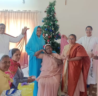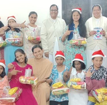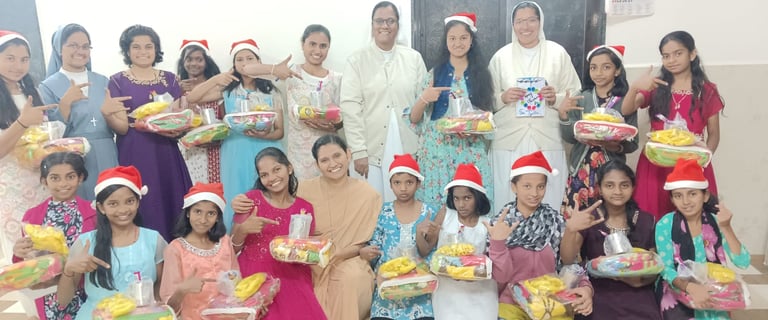 In the evening, sweets and gifts were distributed to the students. The Junior Hostel girls sang Christmas carols and joyfully wished the sisters for Christmas. They also revealed their Christmas friends and shared gifts with one another. The community sisters joined in the celebration by sharing gifts with the girls. The programme concluded with a second Christmas message by Sr. Latha A., encouraging everyone to make room for Christ in their hearts through love, kindness, and service.