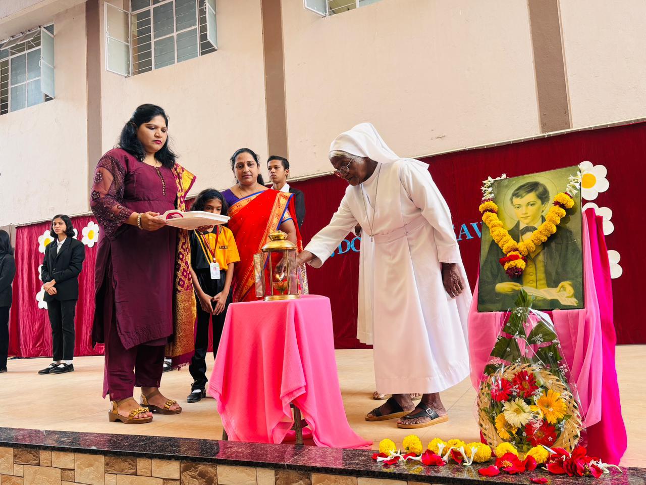 The celebration began with a solemn Prayer Service, led by Sr. Annette and Sr. Margaret, who initiated the ceremony by lighting the lamp, offering a garland and flowers, and reverently venerating the portrait of St. Dominic Savio. A hymn in praise of the young saint played softly in the background, creating a serene and prayerful atmosphere.