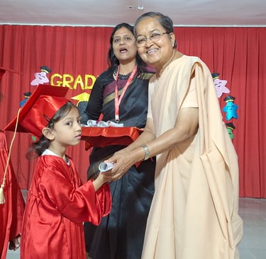 The programme continued with a heartfelt thanksgiving presentation by the students of KG 2, expressing their love and appreciation through meaningful performances. The highlight of the event was the graduation ceremony, where students were formally crowned—beginning with the Gujarati medium section, followed by the English medium section. The excitement and happiness of the children were evident as they proudly received their graduation caps.