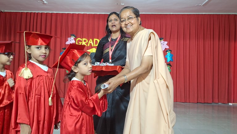 On 11 April 2026, Auxilium Baroda joyfully celebrated a memorable milestone as the Senior KG students completed their pre-primary education. A grand Graduation Ceremony was organized, marking a proud transition for the young learners as they prepare to step into the primary section, Grade 1. The event was graced by the presence of parents, staff and the school management, making the occasion truly special. A total of 167 students were ceremoniously crowned as graduates, symbolizing their growth and readiness for the next phase of their academic journey.