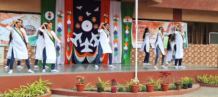 A vibrant series of cultural performances ensued, including patriotic dances, songs, and speeches. Through their presentations, the students beautifully expressed their love and respect for the nation. Prior to the conclusion of the programme, the Chief Guest presented mementoes and certificates to the school Std X and XII toppers and the winners of the state-level drawing competition.