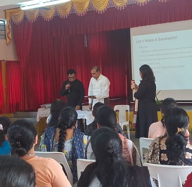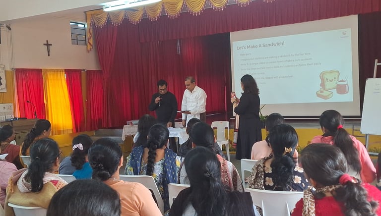 The session began with an engaging ice-breaking activity where teachers introduced themselves using their names along with a suitable adjective that encouraged reflection and active participation. The session focused on two key takeaways — giving clear instructions using five structured steps, demonstrated through a sandwich-making activity, and providing effective feedforward to promote student growth.